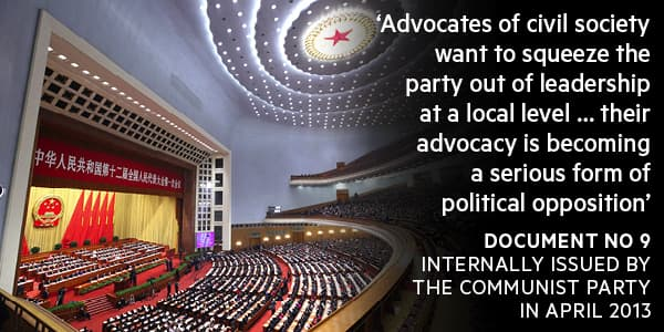 “Western anti-China forces and people with ulterior motives within China view civil society as a magic bullet for advancing social management at the local level [and] have launched all kinds of so-called citizen’s movements,” Document No 9 warned. “Advocates of civil society want to squeeze the party out of leadership at local level … their advocacy is becoming a serious form of political opposition.”