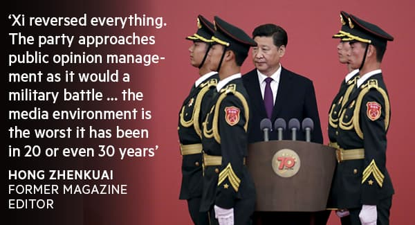 “Xi reversed everything,” adds Hong Zhenkuai, a historian and former editor atYanhuang Chunqiu, a traditionally liberal political magazine created by Communist party elders in 1991. “The party approaches public opinion management as it would a military battle. It is a shame. China’s print media is gasping for its last breath. The media environment is the worst it has been in 20 or even 30 years.”